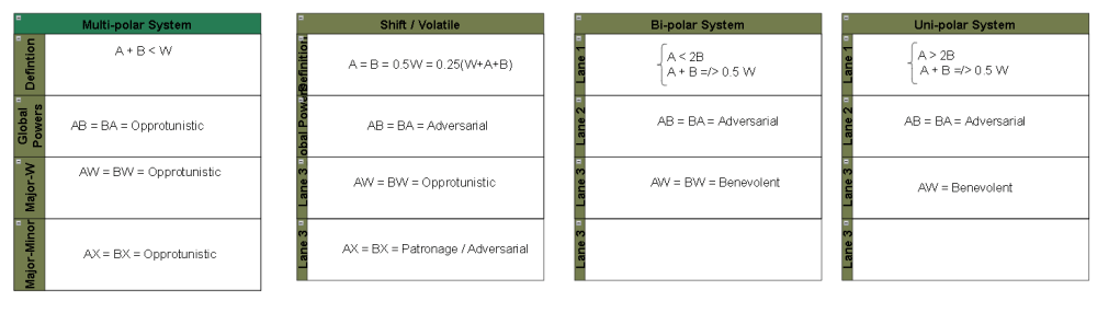 The study of international relations, particularly the realist school of thought, is interested in determining the balance of powers within an anarchic global system. I’ll examine the transitions from one type of system to another, what they bring, and identify precursors.